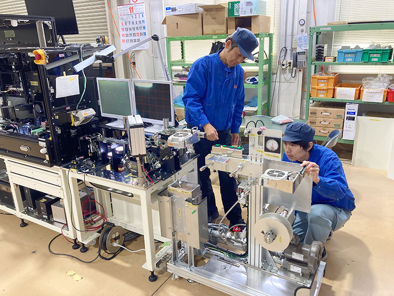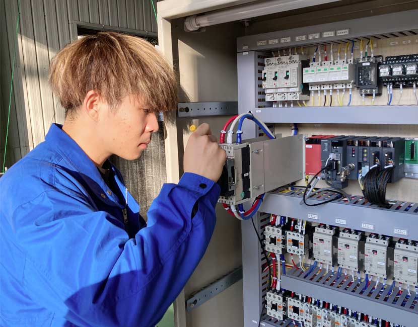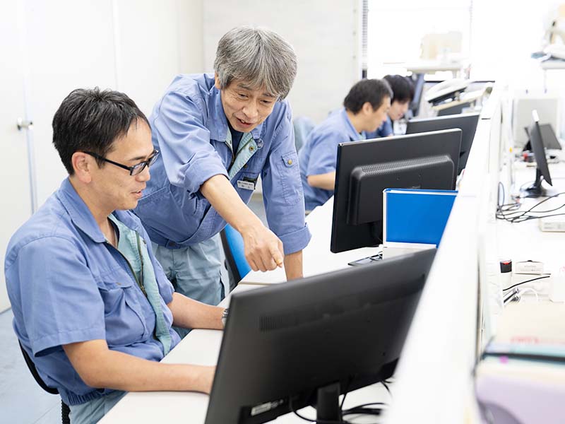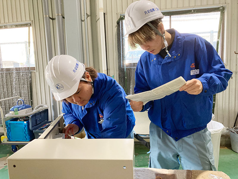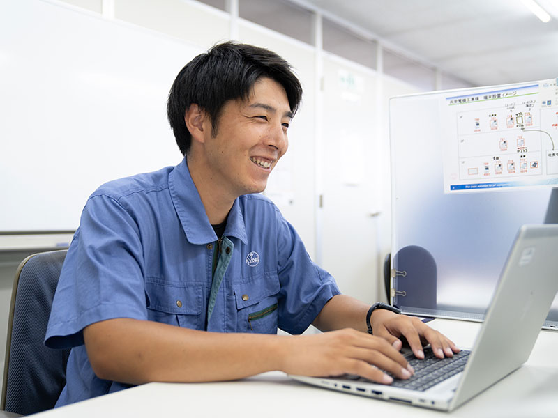 ホーム » 採用案内 共栄電機工業株式会社はこんな会社! 私たちは、滋賀県大津市に工場を構える製造会社です。製造業では、ファクトリーオートメーション(FA化)を進める企業が増えてきました。FA化とは、ロボットやAIを駆使し、生産性を向上させる取り組みのことです。人間の作業を機械やコンピュータに置き換えることで、精度の向上、コスト削減、品質管理の強化を実現します。私たちは生産設備のFA化に携わっております。日々進化する時代の中でお客様のニーズにお応えできるよう私たち自身も前進しながら、モノづくりに情熱を注いでおります。 こんな仕事をしています! Job introduction 設計部門 electrical design 設計技術職は、主にFA制御ハード設計・PLCソフト設計・調整・海外を含むエンドユーザーでの現地立ち上げを行っています。 具体的には、センサーや制御盤を設計するハード設計や、機械を動かすためにPLCを使用して動作させるプログラムを作成するソフト設計をしています。 案件によってはお客様との打ち合わせ・現地での調整なども設計技術職の役割です。 一人前になると、設備仕様打ち合わせからハードソフトの設計、動作確認、現地調整 の全行程を一貫して行います。非常に責任のある仕事です。 設計部門の募集要項はこちら 製造部門 manufacturing 製造部門は、制御盤製作・FA設備機体配線・エンドユーザーでの現地復元工事などを行っています。 具体的には、図面を見ながら制御盤や操作盤の組立配線を行います。また客先での装置配線、完成した制御盤への配線作業もあります。案件によってはお客様との打ち合わせや出張工事にも対応しています。 大事な作業になりますので、エラーやミスが発生しないように現場のチーム同士でコミュニケーションを取り合い、品質保持のための弊社独自の取り組みを徹底しています。 製造部門の募集要項はこちら 共栄電機工業はこんなところ! ONE TEAM 共栄電機工業は設計部門と製造部門が1つになって、1つの製品をつくり上げいくことがほとんどです。チームのコミュニケーションはとても重要で、良いお仕事ができるかどうかを左右します。先輩に話しかけやすい雰囲気はもちろん、業務内容も丁寧に指導しますので、経験のない方でも安心して働いていただけます。時には球技大会でチーム力を団結させたり、地域の清掃も重要なお仕事です。 能力にあった知識を習得できる環境 work environment 入社後は、製造部門・設計部門それぞれの部署に入っていただき、チームの一員として技術・技能を磨いて行きます。弊社では、長年働いているスタッフも多数在籍しておりますので、丁寧に指導します。必要な知識を習得していただき、スキルアップを目指しましょう!また、能力に合わせた研修なども用意しておりますので向上心も高まります。 先輩の声 voice N.Mさん(設計チーム) どんなお仕事をしていますか。 工場で稼働している生産設備の電気設計をしています。主に機体配線や制御盤の図面、設備を動かすためのプログラムを設計しています。規模の大きな仕事では、現場監督も行います。 どんなところにやりがいを感じますか。 生産設備は製造する製品によって多種多様なので、新しい挑戦の連続です。製品は小さなものも壊れやすいものもあるので、毎回苦労しますが設備が完成したときの達成感は大きいです。 なぜ共栄電機工業を選んだのですか。 大津市で技術職を募集している会社は少ないのですが、できるだけ地元での就職を希望していたので入社を決意しました。 職場の雰囲気を教えてください。 皆が黙々と作業していることもあれば、和気藹々としているときもあります。年齢層が幅広く多様な価値観や考え方を持った従業員とコミュニケーションができます。試運転中に難しい問題にぶつかったときは、先輩に相談をしたりしています。 K.Yさん(製造チーム) どんなお仕事をしていますか。 機体配線作業全般です。電線の行先を明記するのに必要なマークチューブうちや、ハーネス作りといった準備作業から、現場での配線作業をしております。時にはお客様と打合せもします。 どんなところにやりがいを感じますか。 私はモノづくりをしているんだと感じることです。作業がしんどい時もありますが、配線した機械が完成し動作するのを見たときは、社員のみなさんとやり遂げた達成感でものすごく特別なものを感じます。 なぜ共栄電機工業を選んだのですか。 私は転職してこの会社に入社しました。前職はサービス業界にいました。小さいころからモノづくりには興味がありましたが、電気の知識もないためあきらめておりました。ですが、たまたま接客をしたお客様に共栄電機工業の方がおられ、仕事について伺っているうちにモノづくりに携わりたいという想いが再燃しました。電気については無知でしたが、先輩方が細かく説明してくださるし、気にかけてくださり、この会社に入って良かったと思っています。 職場の雰囲気を